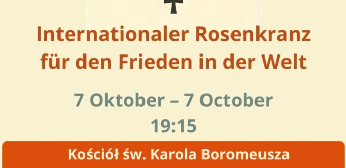 Internationaler Rosenkranz für den Frieden in der Welt 2025.Auch dieses Jahr sind wir eingeladen, zusammen mit den fremdsprachigen Gemeinden Breslaus einen Rosenkranz für den Frieden in der Welt in unseren jeweiligen Sprachen zu beten. Diese Andacht wird am Festtag der Rosenkranzkönigin, Samstag dem 7. Oktober 2025, um 19.15 Uhr, in der St. Carl Borromäus-Kirche in […]