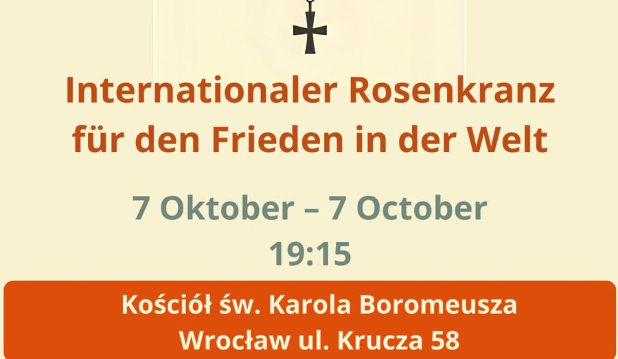Internationaler Rosenkranz für den Frieden in der Welt 2025.Auch dieses Jahr sind wir eingeladen, zusammen mit den fremdsprachigen Gemeinden Breslaus einen Rosenkranz für den Frieden in der Welt in unseren jeweiligen Sprachen zu beten. Diese Andacht wird am Festtag der Rosenkranzkönigin, Samstag dem 7. Oktober 2025, um 19.15 Uhr, in der St. Carl Borromäus-Kirche in […]